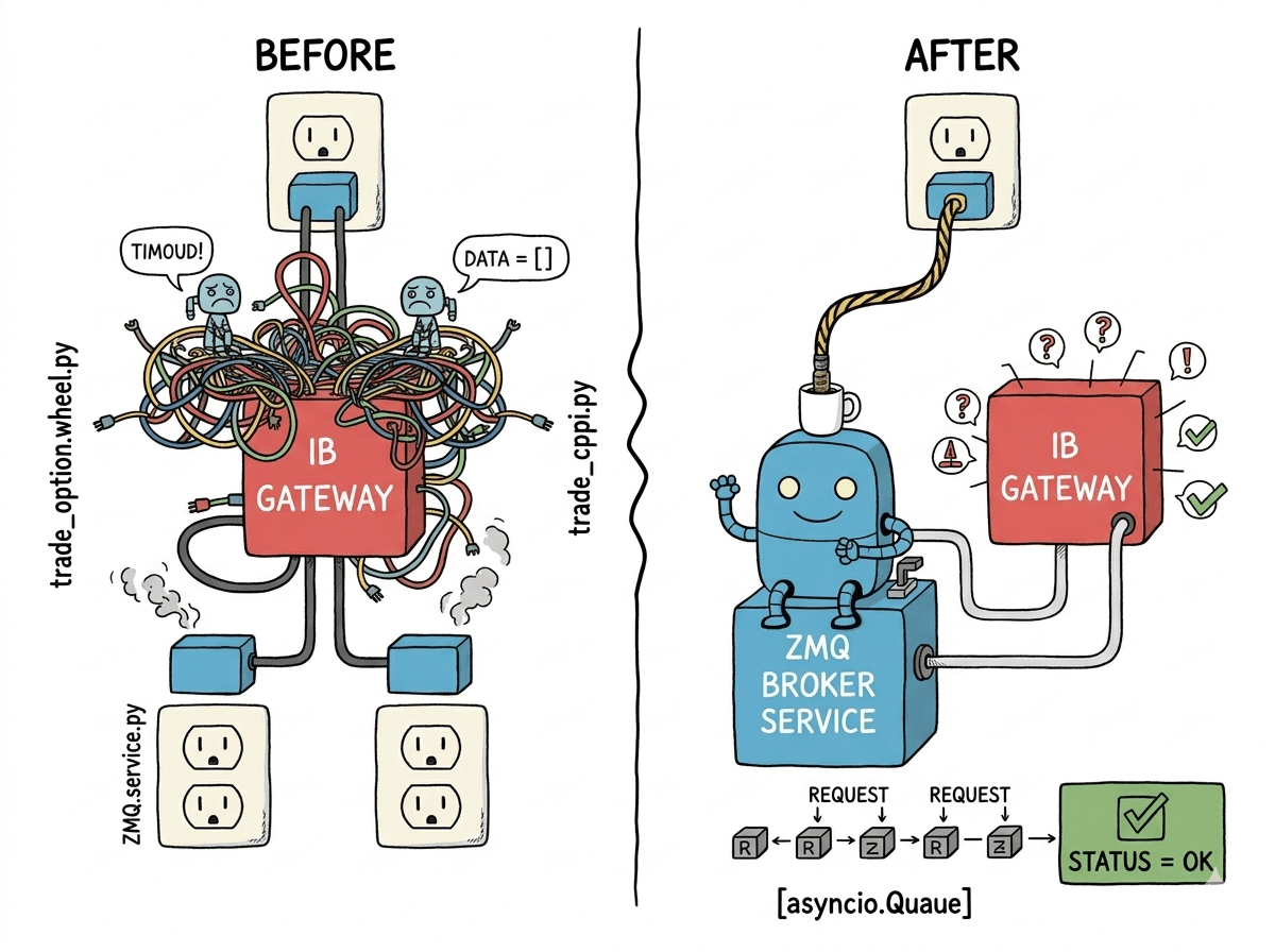 I’d been sitting on the fix for a while: a message queue in the middle, one process owning the IB connection, everything else talking to it. The architecture was clear in my head. I just didn’t have the time to build it solo. Now, since the AI coding capability improves drastically, I finally decided to open the Claude Code and said: “I have an idea. Help me build it.“