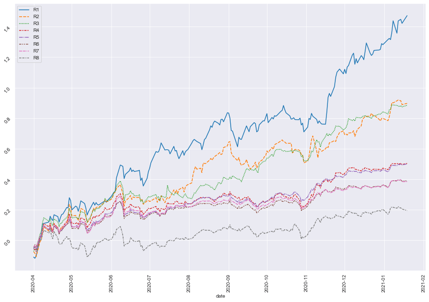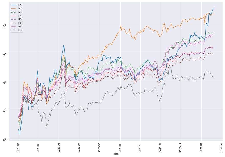 - Add up the daily return in the same group and compare it to the other groups over time.