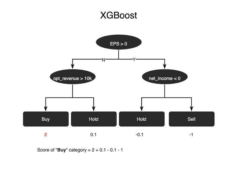 XGBoost is a tree-like classification model. By inputting data into the tree-like trained model, the model will generate relative scores in each end leaf. After adding up all the scores presented in the leaves and applying the sigmoid function, we will have our final prediction for that specific test data. Essentially, it’s a different technique than the previous two algorithms.